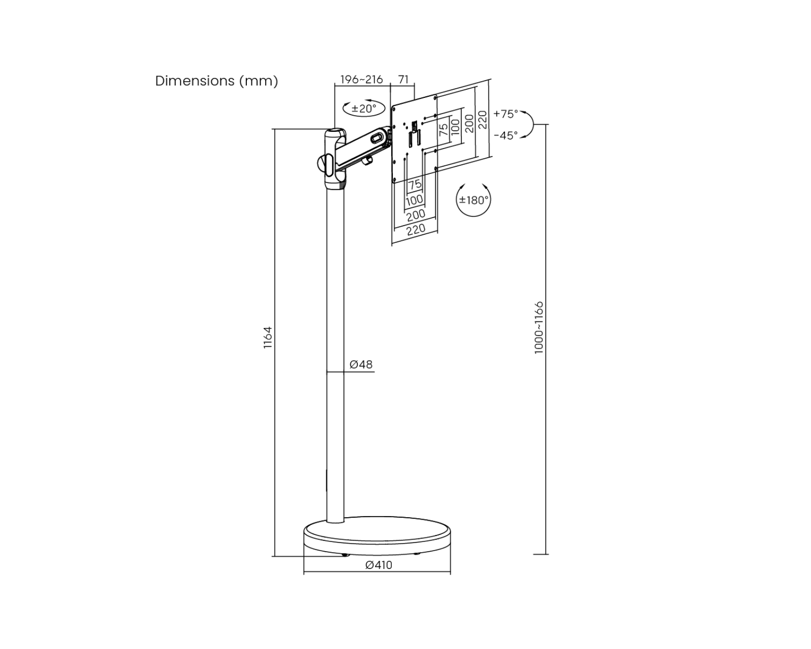 MaxMountin tukeva TV-lattiateline säädettävällä varrella on suunniteltu 17?43 tuuman televisioille. Se on VESA-yhteensopiva 75x75 - 200x200 tuuman kokoisille televisioille, joten se sopii monipuolisesti erilaisille näytöille. TV-lattiateline sopii sekä koteihin että toimistoihin, joissa tarvitaan joustavuutta ja säätömahdollisuuksia television sijoittelussa.Jalusta on valmistettu alumiinin, teräksen ja muovin yhdistelmästä, mikä tarjoaa tukevan rakenteen ja on samalla helppo liikutella. Mitat ovat 410x410x1222 mm, ja sen painokapasiteetti on 5?17 kg. Siinä on vapaasti kallistuva rakenne, jonka kallistuskulma on +75° - -45°, sekä +20° - -20° kääntökyky ja -180° - +180° pyörimiskyky. Sisäänrakennetut jouset mahdollistavat painonsäädön ja pohjassa olevat piilotetut pyörät mahdollistavat sujuvan liikuttelun. Jalustassa on myös kaapelinhallintajärjestelmä, joka pitää kaapelit järjestyksessä.