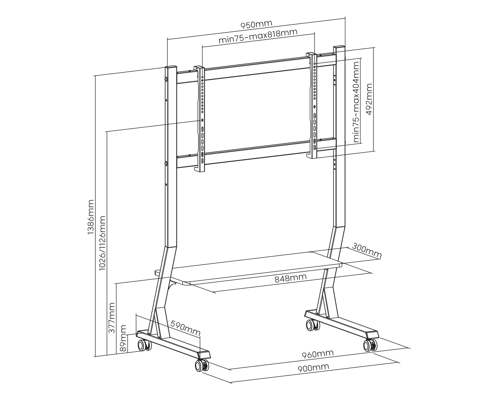 MaxMount-televisioteline pyörillä on käytännöllinen ratkaisu käyttäjille, jotka haluavat parantaa katselukokemustaan. Teline tukee 45?90 tuuman näyttöjä ja sen enimmäispainokapasiteetti on 60 kg. Kestävän teräsrakenteensa ansiosta se yhdistää vakauden ja liikkuvuuden ja sopii erinomaisesti sekä koti- että toimistoympäristöihin.Tässä TV-tasossa on lukittavat pyörät, jotka mahdollistavat helpon liikuttelun eri lattiapinnoilla ja varmistavat samalla vakauden, kun jalusta on paikallaan. Tukevat teräsjalat tarjoavat lisätukea ja minimoivat television kaatumisriskin. Jalustassa on myös mediahylly näytön alla, joka tarjoaa tilaa taittuville laitteille, kuten pelikonsoleille ja kaapelivastaanottimille, mikä edistää järjestelmällistä asennusympäristöä. Korkeudensäätö on kaksitasoinen, mikä tarjoaa joustavuutta näytön asennon mukauttamiseen tarpeen mukaan, olipa kyseessä sitten elokuvanäytökset tai yritysesittelyt. Jalustan mitat ovat leveys 960 mm, syvyys 590 mm ja korkeus 1386 mm, joten se on sekä kompakti että tehokas.