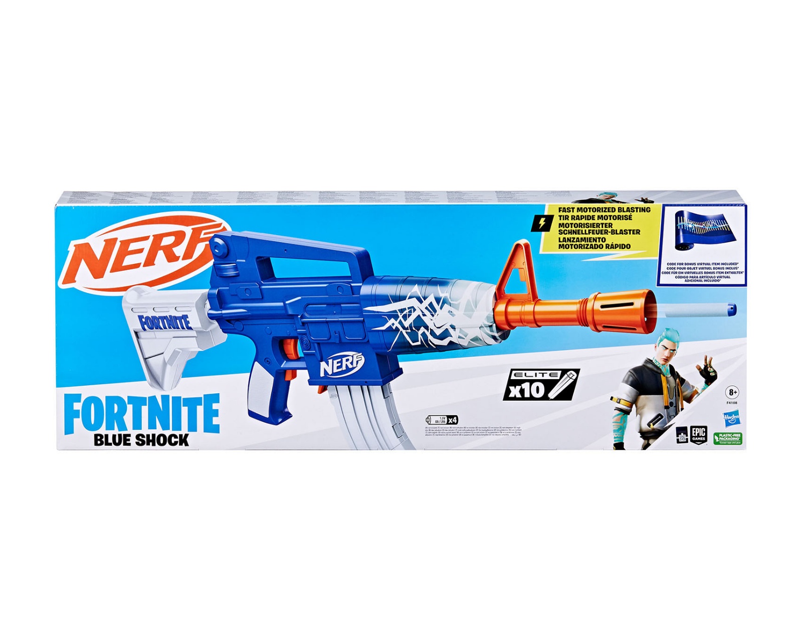 Nerf Fortnite Blue Shock on moottoroitu blaster, joka perustuu suosittuun Fortnite-peliin. Siinä on ampumajärjestelmä, joka voi ampua 10 nuolta nopeasti peräkkäin. Blasterissa on irrotettava lipas, joka mahtuu 10 Elite-vaahtomuovinuolta ja se vaatii toimintaan 4 AA-paristoa. Se on suunniteltu sekä sisä- että ulkoleikkejä varten ja sopii peliharrastajan kokoelmaan.Blasterin rakenne on kestävä ja käytännöllinen aktiiviseen käyttöön, painottaen kestävyyttä. Moottoroitu mekanismi mahdollistaa nopean laukaisun ja yhtenäisen ammunnan virtauksen. Tyylikkään Blue Shock Wrap -suunnittelun ansiosta blaster on sekä esteettisesti miellyttävä että toimiva. Mukana oleva bonuskoodi avaa The Beat Wrapin Fortnite-pelissä, jolloin käyttäjä voi mukauttaa pelihahmoaan. Suositellaan käytettäväksi suojalaseja, jotka eivät sisälly pakkaukseen.