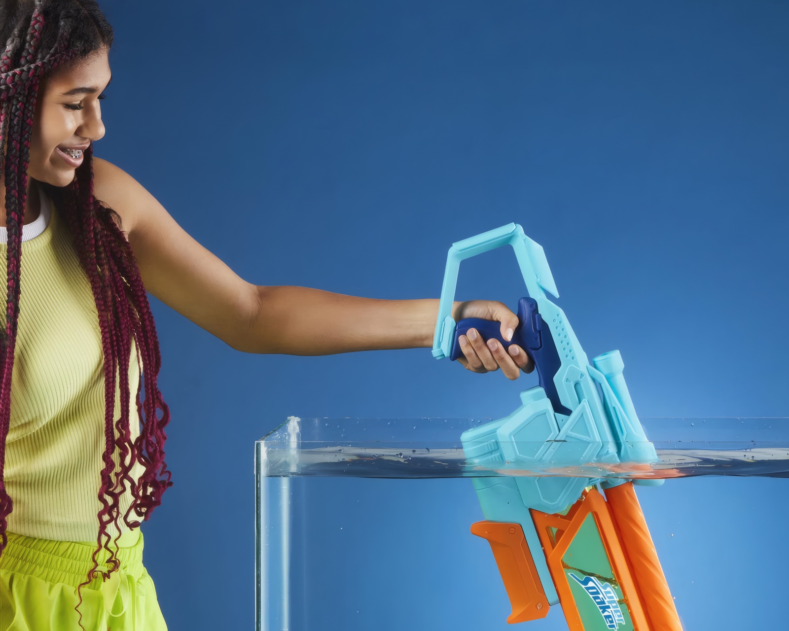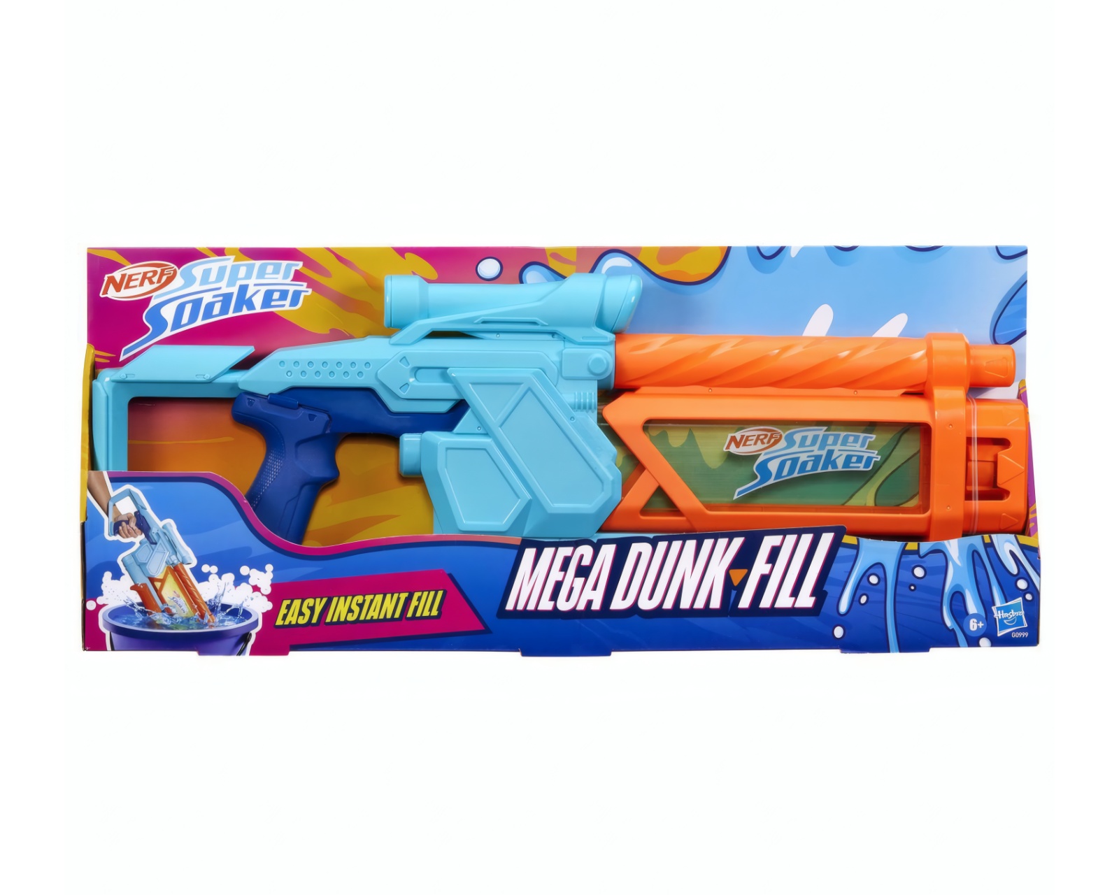 Super Soaker Dunk Fill Mega on Nerfin vesipuhallin, joka tarjoaa nopean täytön ja kapasiteetin 1005 ml. Se on suunniteltu edistämään vesileikkiä ulkona. Laite mahdollistaa välittömän täytön dippaamalla säiliön veteen, mikä säästää aikaa leikissä. Se on rakennettu läpinäkyvällä säiliöllä, jotta käyttäjä voi seurata nesteen tasoa.Aktivoidakseen puhallintoiminnon käytetään pumppumekanismia, jossa kahvaa painetaan edestakaisin, mikä luo voimakkaan kostutuksen. Varustettu tähtäimellä, se tarjoaa tarkkuussuuntausta ja on mukautettu käytettäväksi lasten kanssa, mikä edistää aktiivista ja fyysistä leikkiä.
