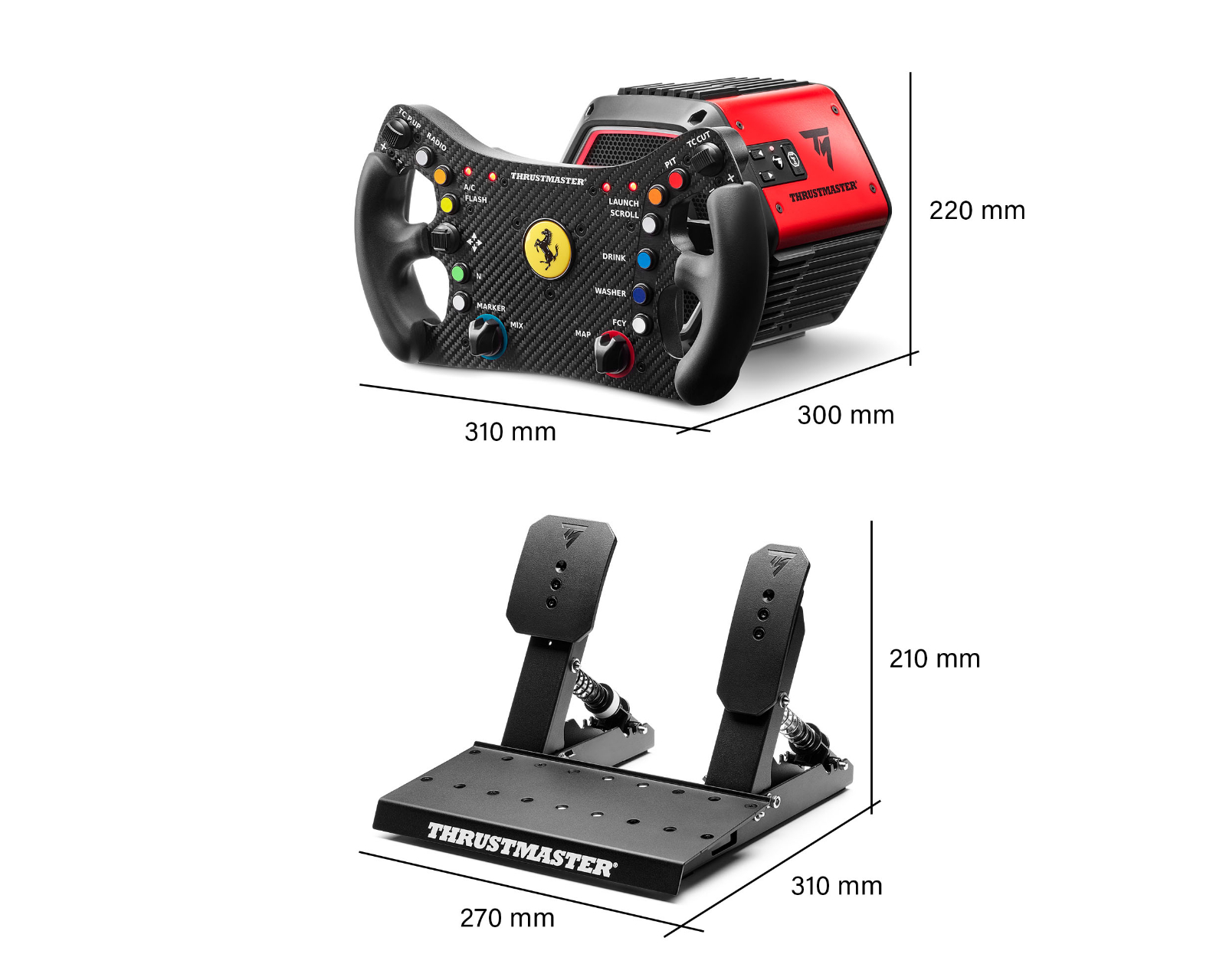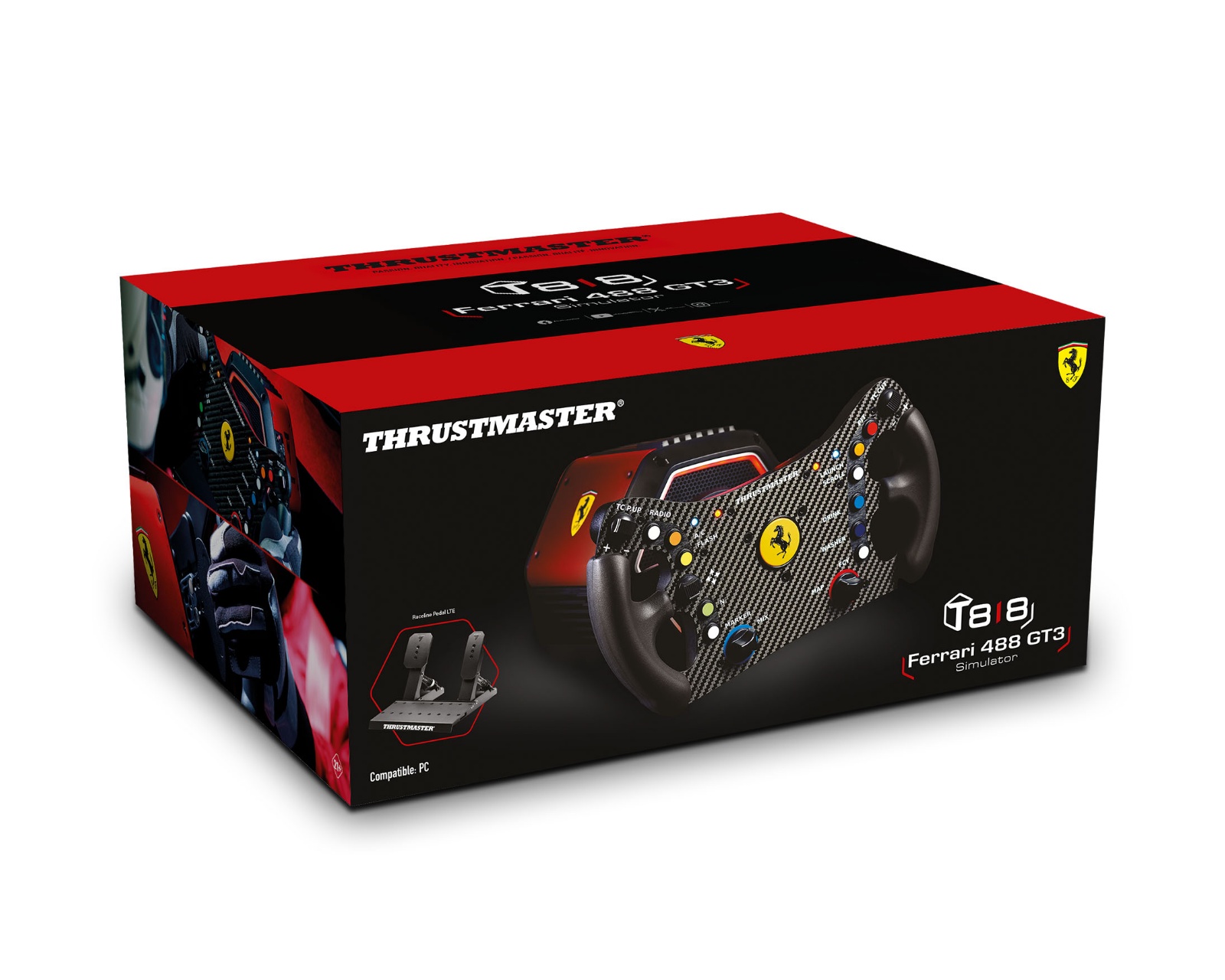 T818 Ferrari 488 GT3 Simulator on kilpa-paketti, joka yhdistää edistyksellisen tekniikan viralliseen lisensointiin Ferrarilta. Se koostuu T818 Direct Drive -kannasta, Ferrari 488 GT3 ohjaimesta ja Raceline Pedals LTE -polysetistä, mikä tekee siitä ihanteellisen vakaville pelaajille, jotka etsivät autenttista kilpailukokemusta. T818-kanta tarjoaa jatkuvaa vääntömomenttia 10 N·m erinomaisella vasteella, joka antaa välitöntä palautetta ja tuntumaa. Uuden T818-kannan kestävä rakenne tarkoittaa vahvistettua liitosta ja optimoitua moottoria, joka lisää luotettavuutta.Yhdessä My Thrustmaster Panel -ohjelmiston kanssa käyttäjät voivat mukauttaa Force Feedback -asetuksiaan ja tallentaa asetuksiaan räätälöityä pelikokemusta varten. Mukana oleva Ferrari 488 GT3 ohjain on täysikokoinen replika, jossa on 11 painiketta, 4 kooderia, D-pad ja Mag-Shift vaihdekepit nopeaa ja tarkkaa vaihtamista varten. Raceline Pedals LTE -polysetti tarjoaa myös ilmanpainetta ja säädettävän rakenteen, joka mahdollistaa käyttäjien hienosäätää asetuksiaan ajotyyliinsä sopivaksi.