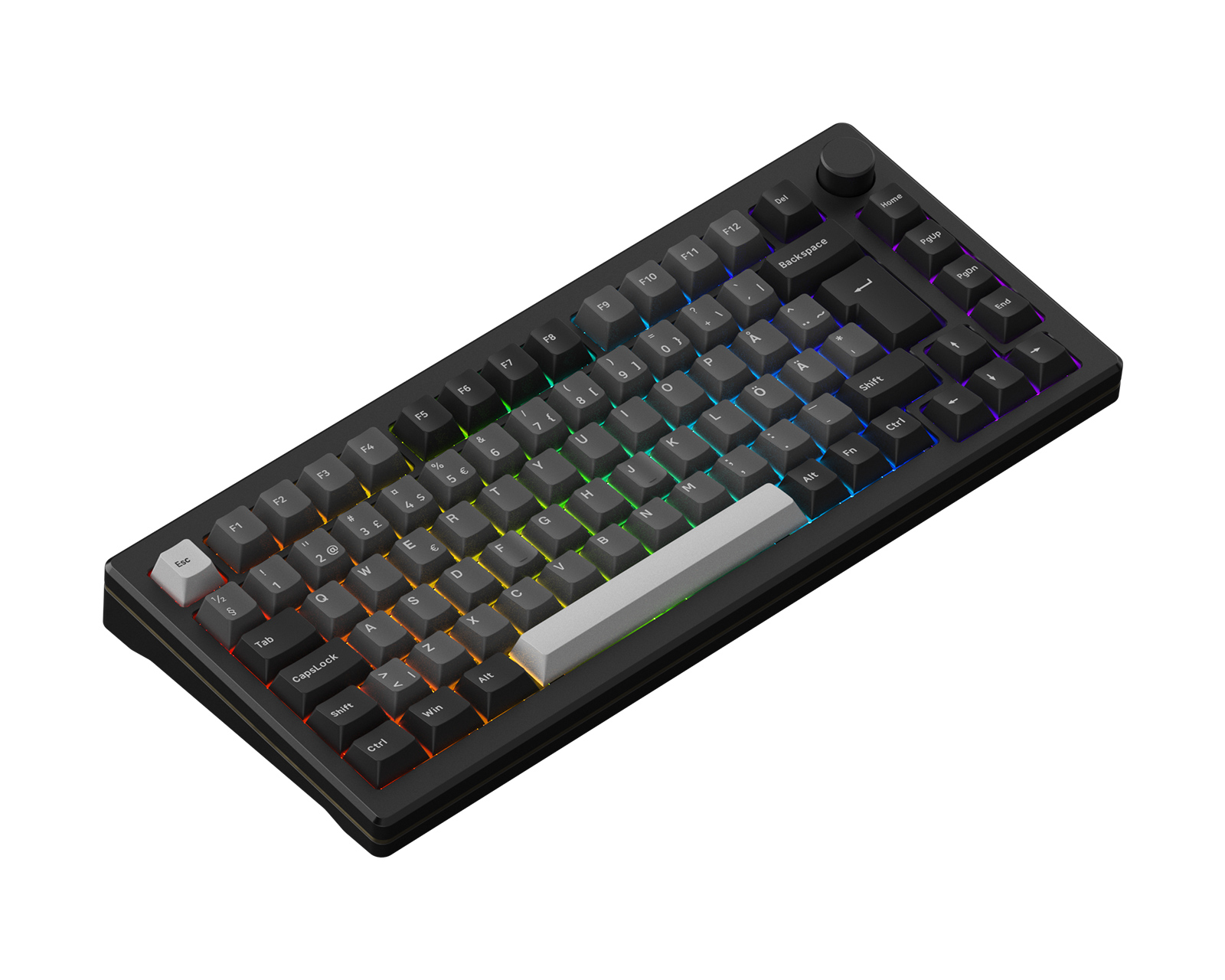 MOD 007B HE:ssä on nuppi, jonka avulla voit helposti säätää äänenvoimakkuutta, valoa ja muita asioita. Tämän kätevän laitteen avulla voit mukauttaa ympäristöäsi yksinkertaisella kierteellä, jolloin voit hallita täysin äänitasoja, valaistusta ja muita näppäimistön toimintoja.