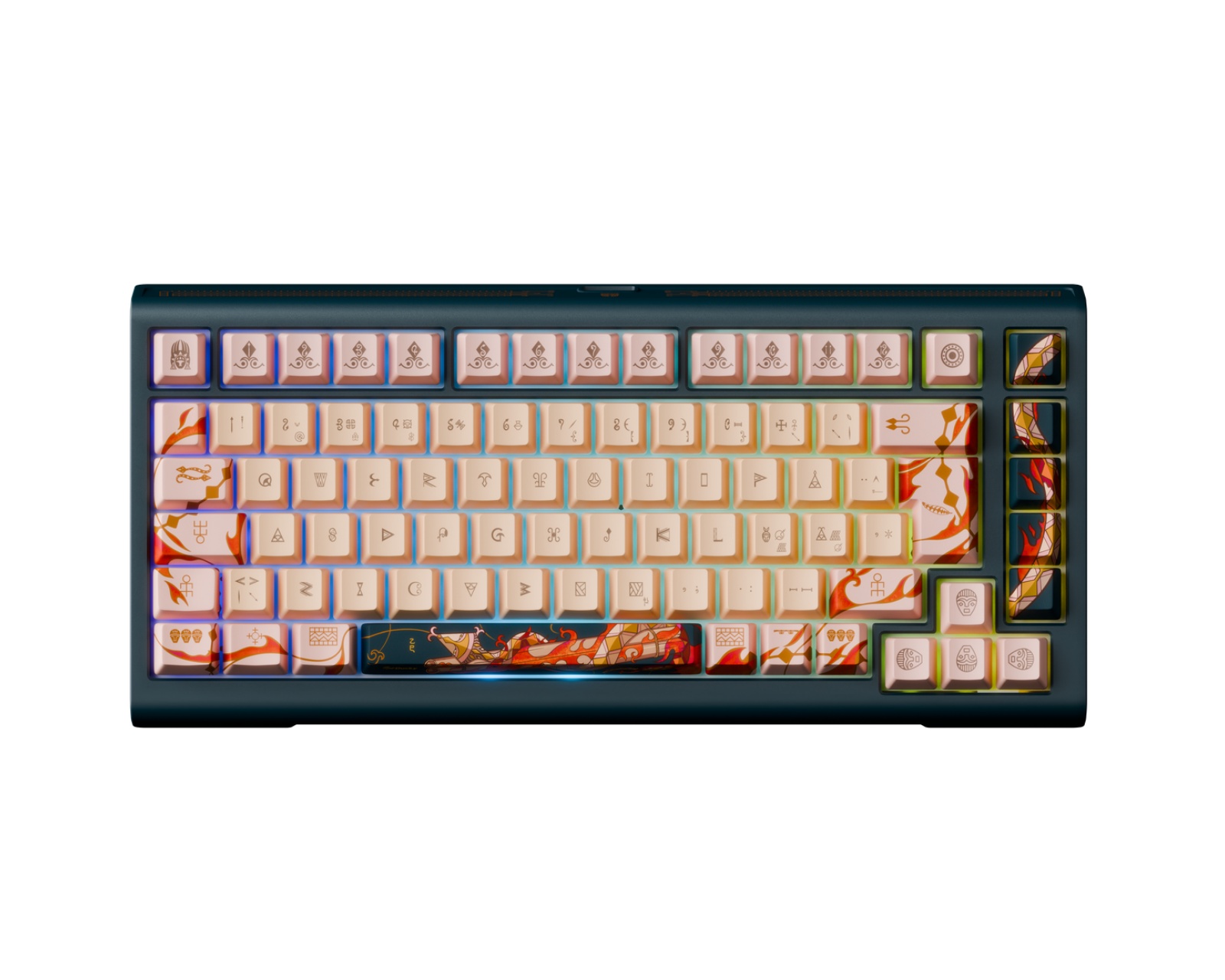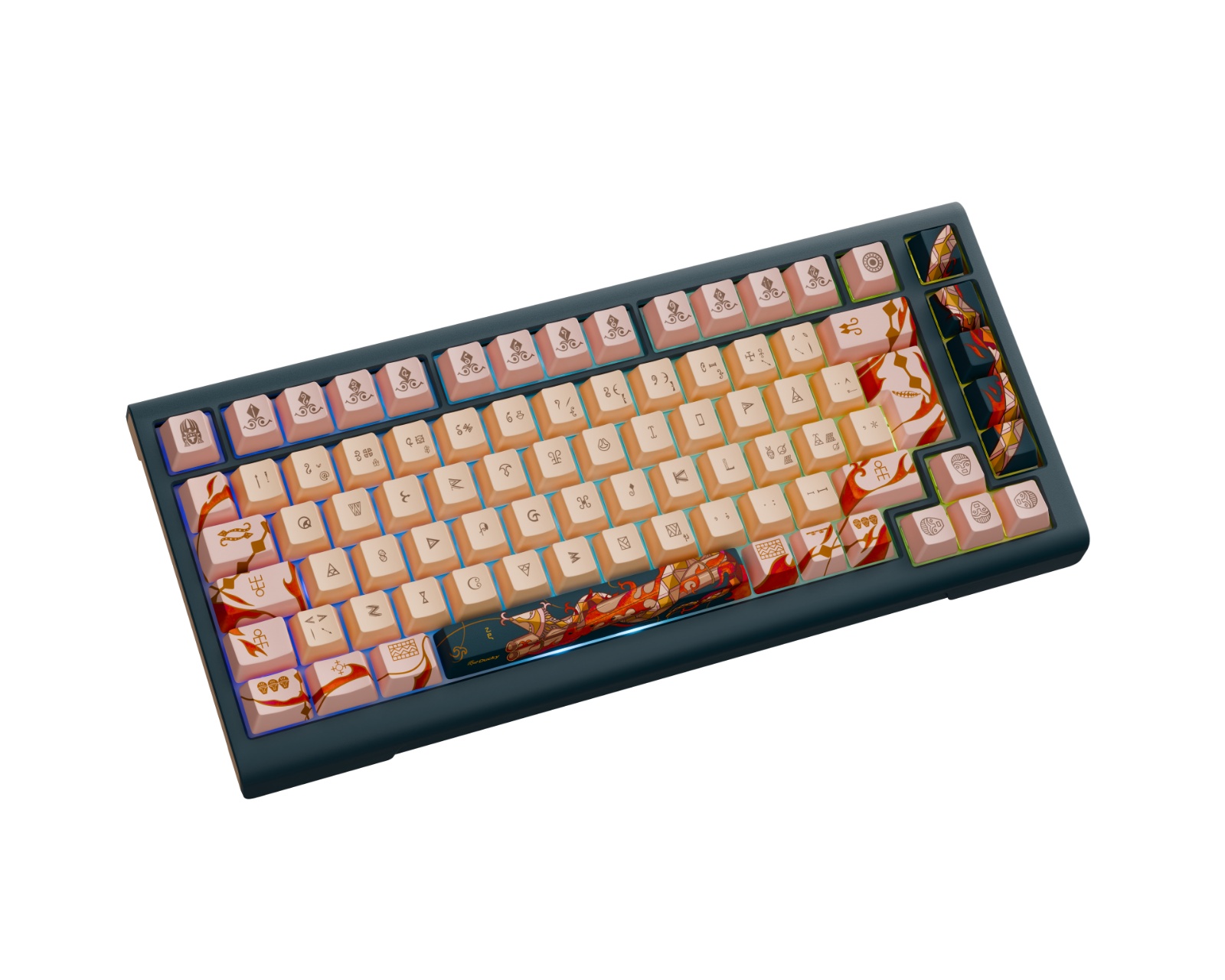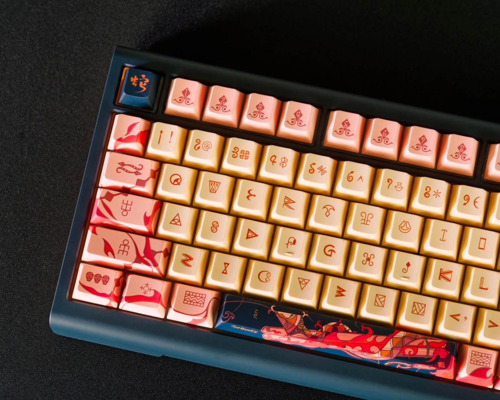 År av ormen 2025 Rajoitettu painos Näppäimistö on pelinäppäimistö Duckyltä. Se tarjoaa ainutlaatuisen rakenteen kaasupohjalla ja FR4-levyllä, sekä aidot Cherry MX2A kytkimet. Näppäimistö on suunnattu pelaajille ja innokkaille käyttäjille, jotka haluavat mukautettavan ja teknisesti kehittyneen laitteen.Näppäimistössä on eteläsuuntainen RGB PCB, jossa on Kailh keltaiset hotswap-alustat, mikä mahdollistaa kytkinten helpon vaihdon. Se sisältää PE-kytkinvaimentimet ja Poron-alustapehmusteen, joka vähentää melutasoa ja lisää mukavuutta. Cherry-profiilin näppäinkappaleet, joissa on dye-sublimoidut kuviot, takaavat pitkän kestävyyden ja selkeyden designissa. Kolme tasoa säädettäviä jalkoja ja irrotettava punottu USB-C-kaapeli tekevät laitteesta sekä toimivan että käyttäjäystävällisen. Vakausratkaisu taataan ruuvikiinnitettyjen PCB-stabilisaattorien avulla. Merensininen yläosa ja beigen värinen alaosa, koristeltuna yksityiskohtaisilla taidekuvioilla, vahvistavat näppäimistön esteettistä arvoa. Näppäimistö on rajoitettu 2025 laitteeseen maailmanlaajuisesti.