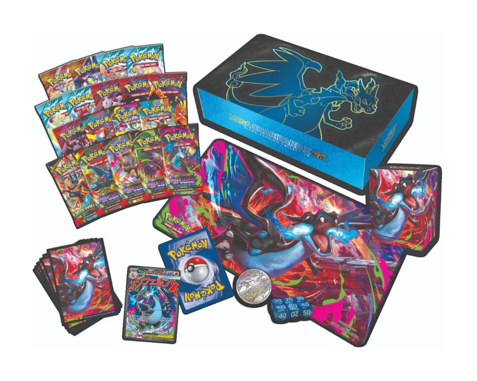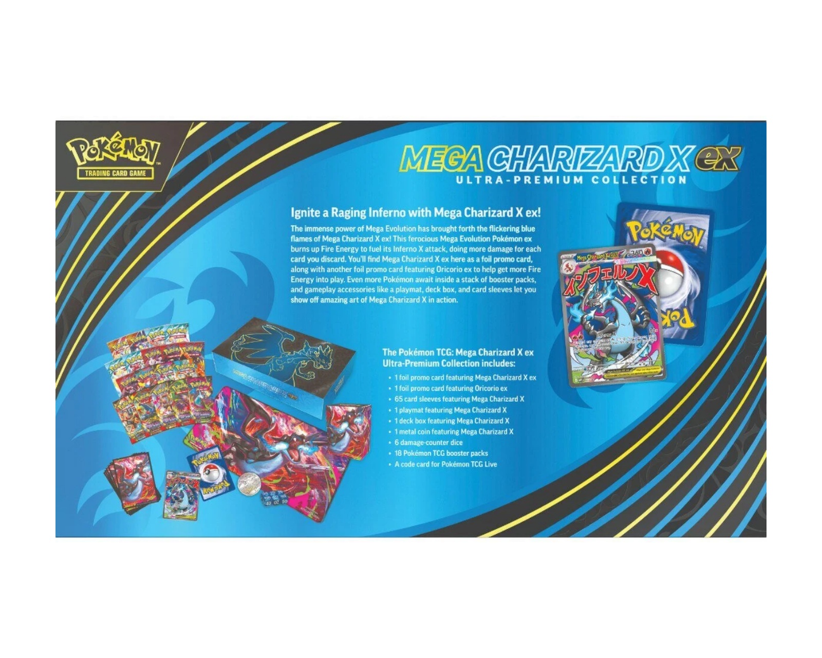 Mega Charizard X ex Ultra-Premium Collection on Pokémonin tuote, joka tarjoaa joukon erikoiskortteja ja tarvikkeita keräilykorttipeliin. Kokoelma sisältää foil-promo-kortin Mega Charizard X ex ja foil-promo-kortin Oricorio ex sekä erilaisia pelitarvikkeita. Sisältö laatikossa sisältää 65 korttisuojaa, joissa on kuvituksia Mega Charizard X:stä, pelimatto samalla teemalla, korttilaatikko, metallikolikko ja kuusi damage-counter-noppaa. Lisäksi mukana on 18 booster-pakettia, mikä tarjoaa mahdollisuuden laajentaa kokoelmaa. Korttien laatu on standardi Pokémon-korteille, ja kaikki kortit on suunniteltu suojaamaan pelaajaa ja tarjoamaan ainutlaatuinen pelielämys. Kokoelma on suunniteltu tukemaan sekä keräilyä että pelaamista, mikä tekee siitä ihanteellisen niin aloittelijoille kuin kokeneille pelaajille. Yhteenveto- Sisältää Mega Charizard X ex ja Oricorio ex foil-muodossa