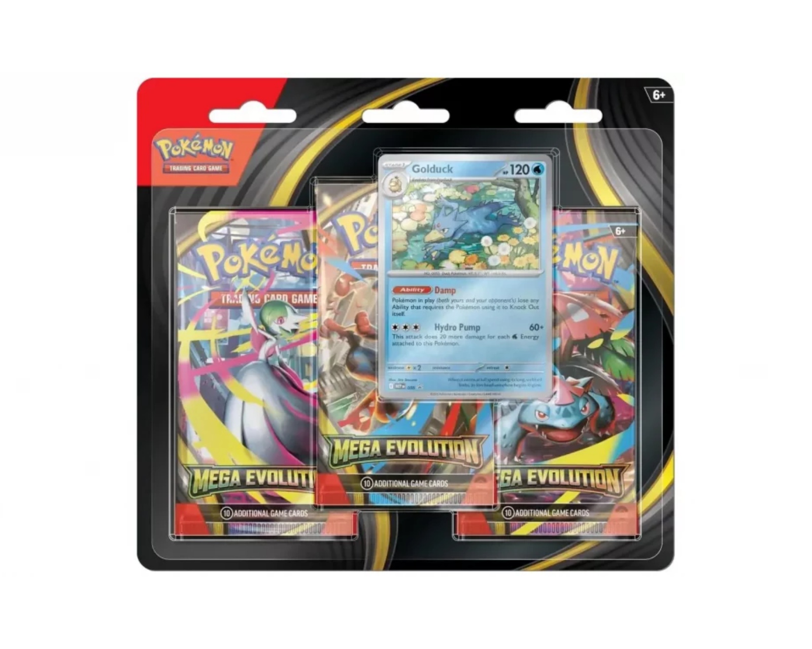 Mega Evolution Blister 3-Pack on tuote Pokémonilta, joka tarjoaa ainutlaatuisen kokemuksen keräilijöille ja pelaajille. Setti sisältää erityisen foil promo-kortin joko Psyduckista tai Golduckista, mikä tuo kokoelmaan ylimääräisen ulottuvuuden. Lisäksi mukana on kolme booster packia Pokémon TCG:stä: Mega Evoluutiot, joista jokainen pakka sisältää 10 pelikorttia sekä 1 Basic Energy tai TCG Live -koodikortin. Korttien moninaisuus tarjoaa jännittävän ja ennakoimattoman pelikokemuksen.Ainutlaatuinen foil promo-kortti on keräilyesine, joka voi vahvistaa pelaajan korttikokoelmaa ja strategioita pelissä. Booster pakit on huolellisesti koottu ja ne sisältävät kortteja erilaisista tyypeistä ja harvinaisuuksista, mikä tekee jokaisesta avaamisesta kiinnostavan kokemuksen. Setti on suunnattu intohimoisille Pokémon-keräilijöille ja pelaajille, jotka ovat kiinnostuneita laajentamaan korttejaan ja strategioitaan Pokémon TCG:ssä. Erityistä huomiota kiinnitetään siihen, että kortit booster pakissa vaihtelevat, mikä tekee jokaisesta setistä ainutlaatuisen.