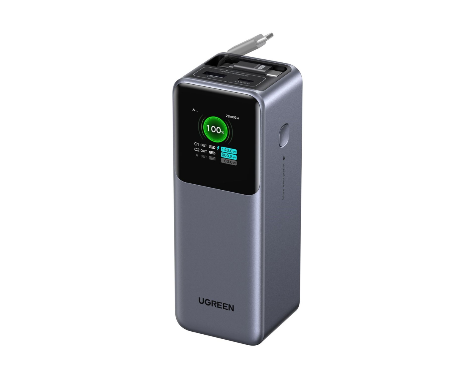 20000mAh 165W Powerbank, jossa on ulosvedettävä kaapeli UGREENilta, on tehokas ja kompakti ratkaisu eri laitteiden lataamiseen. UGREENin powerbank tarjoaa yhteensä 165W lähtötehoa, mikä mahdollistaa MacBook Pro:n lataamisen 54 %:iin vain 30 minuutissa. Se pystyy lataamaan jopa kolme laitetta samanaikaisesti ja siinä on ulosvedettävä kaapeli, joka helpottaa käyttöä ja kuljetusta.Powerbankilla on kapasiteetti 20,000mAh, mikä riittää iPhonen lataamiseen lähes neljä kertaa tai MacBook Airin lataamiseen kerran. Vankka rakenne sisältää kaapelin, joka on testattu yli 25,000 ulosvetämistä ja 10,000 taivutusta, mikä takaa kestävän käytön. Laite on myös varustettu Thermal Guard™-tekniikalla, joka varmistaa, että lataus pysyy turvallisena ja viileänä. Reaaliaikaisen tiedon näyttö mahdollistaa helpon yleiskatsauksen virrankulutukseen.