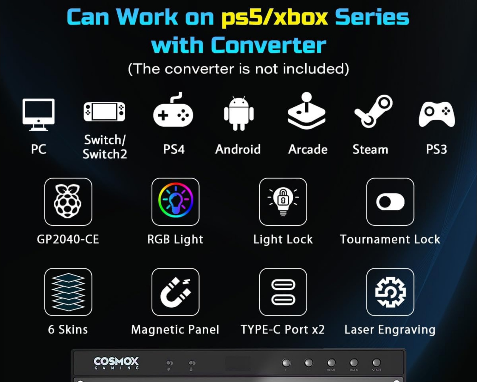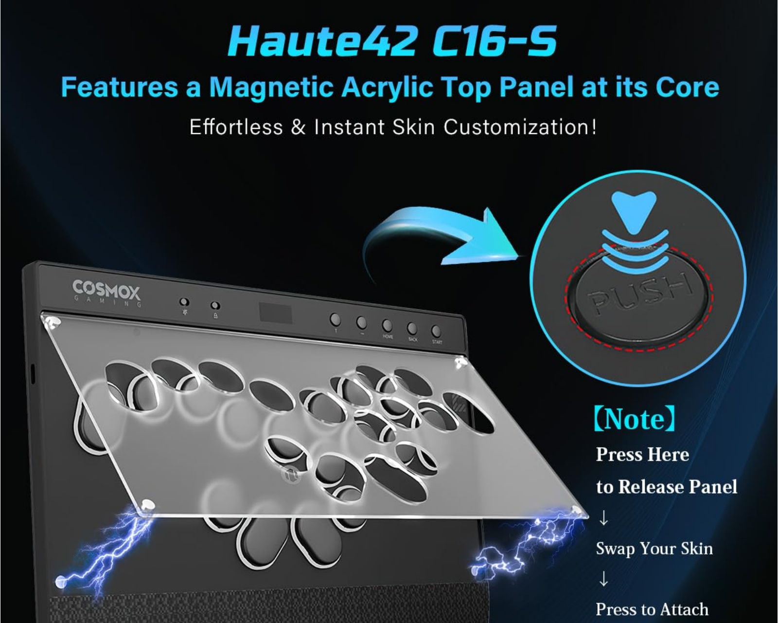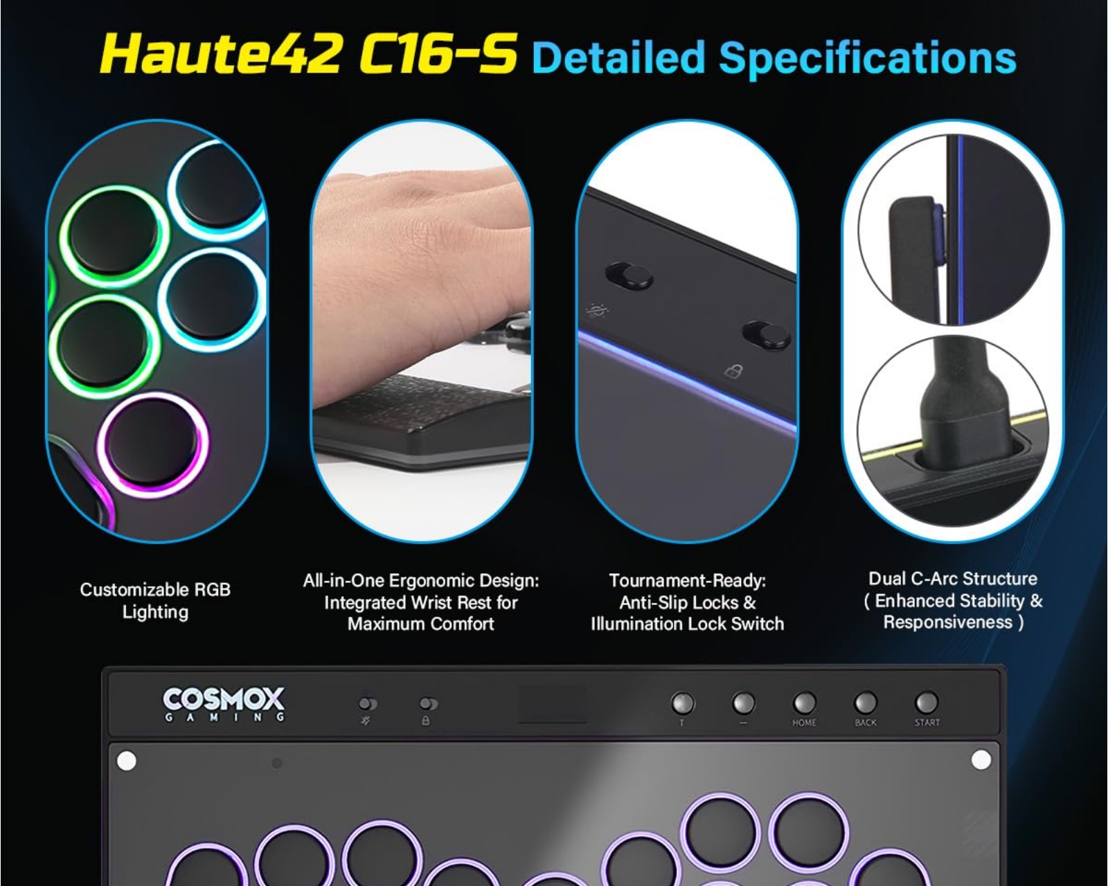 Haute42 C16-S Arcade Controller on mullistava peliohjain, joka yhdistää modernin muotoilun edistykselliseen tekniikkaan. Ainulaatuisen magneettisen paneelikonseptin ansiosta käyttäjä voi helposti räätälöidä pelikokemustaan ilman ruuveja.C16-S:n ergonominen muotoilu ja RGB-renkaat ympärillä nappeja tarjoavat sekä visuaalista vetovoimaa että käytännön toiminnallisuutta. Toimitukseen sisältyy myös taideteemamalleja henkilökohtaista mukauttamista varten sekä turnaussalpa, joka estää ei-toivottuja painalluksia intensiivisessä pelaamisessa. Ultra-alhaisen viiveen ansiosta, joka on alle 1 ms, ja laiteohjelmistopäivitysten tuen kanssa, se takaa vakaan ja luotettavan pelikokemuksen.