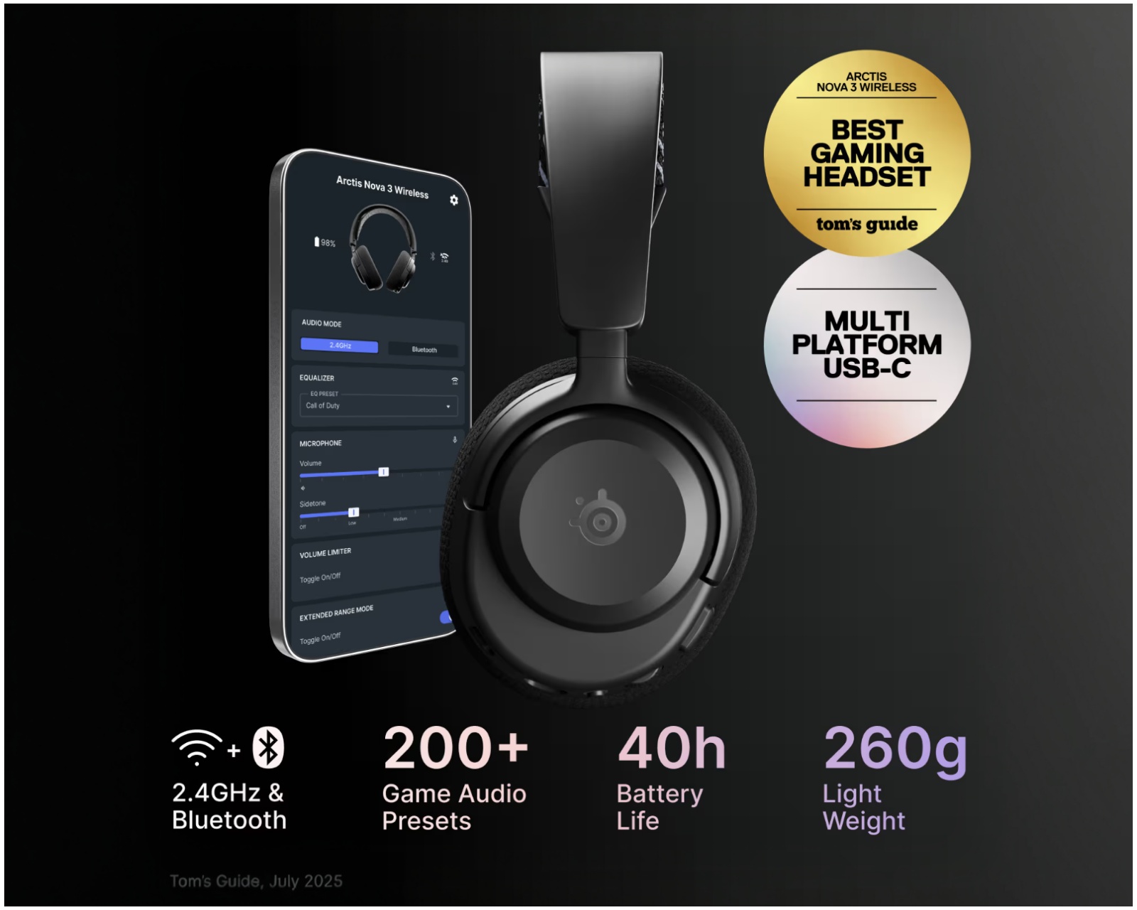 ClearCast Gen 2 -mikrofoni vähentää taustamelua ja takaa selkeät puhelut. Vaihda helposti 2,4 GHz -yhteyden ja Bluetooth 5.3:n välillä sujuvaan multitaskingiin. Paranna äänikokemustasi huipputason peleissä Arctis Nova -sovelluksella, joka tarjoaa yli 100 esiasetusta.