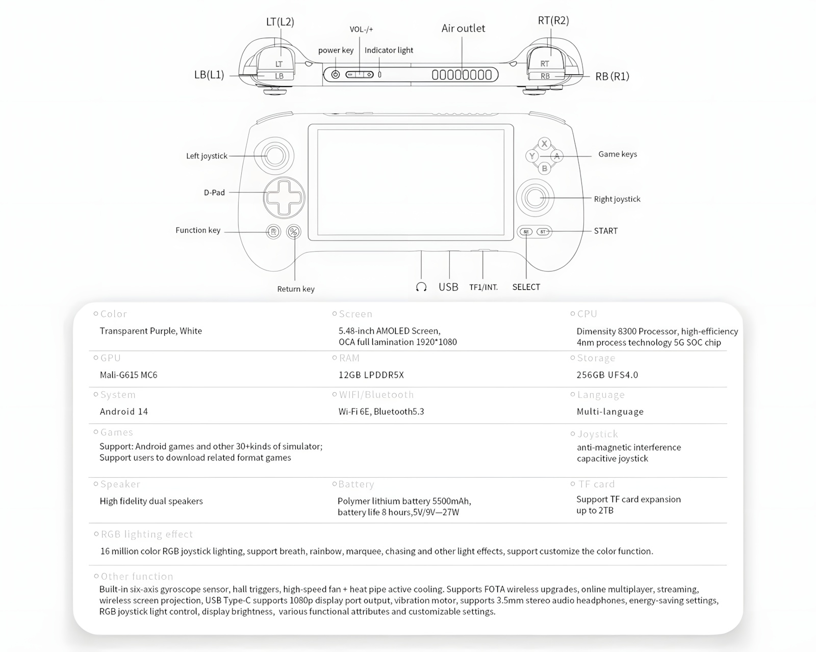 RG557 on Anbernicin retro-emulaattori, jonka avulla voit pelata sekä klassisia että moderneja pelejä ja emulaattoreita. Se on rakennettu Dimensity 8300 -prosessorille, joka tukee tehokasta moniajoa ja pelitehoa. 5,48 tuuman AMOLED-näytön ja 1920x1080-resoluution ansiosta se pystyy käsittelemään myös HD-sisältöä. RG557 on suunnattu peliharrastajille ja retropelien ystäville.Tämä konsoli on varustettu kahdeksanytimisellä prosessorilla ja Mali-G615-näytönohjaimella, jotka tarjoavat nopean ja sujuvan grafiikan renderöinnin. 12 Gt:n LPDDR5X RAM -muistin ja 256 Gt:n UFS 4.0 -tallennustilan ansiosta käyttäjät voivat tallentaa yli 8 000 peliä. RG557 käyttää Android 14 -käyttöjärjestelmää ja tukee sekä WiFi 6E:tä että Bluetooth 5.3:a vakaan langattoman yhteyden takaamiseksi. 5 500 mAh:n polymeerilitium-akku tarjoaa noin 8 tuntia käyttöaikaa, ja konsolissa on kattava valikoima porttia, kuten USB Type-C ja 3,5 mm:n äänilähtö kuulokkeille. RGB-valaistustehosteiden ja sisäänrakennetun kuusiakselisen gyroskooppianturin ansiosta se tarjoaa myös lisätoimintoja dynaamisempaan pelikokemukseen.
