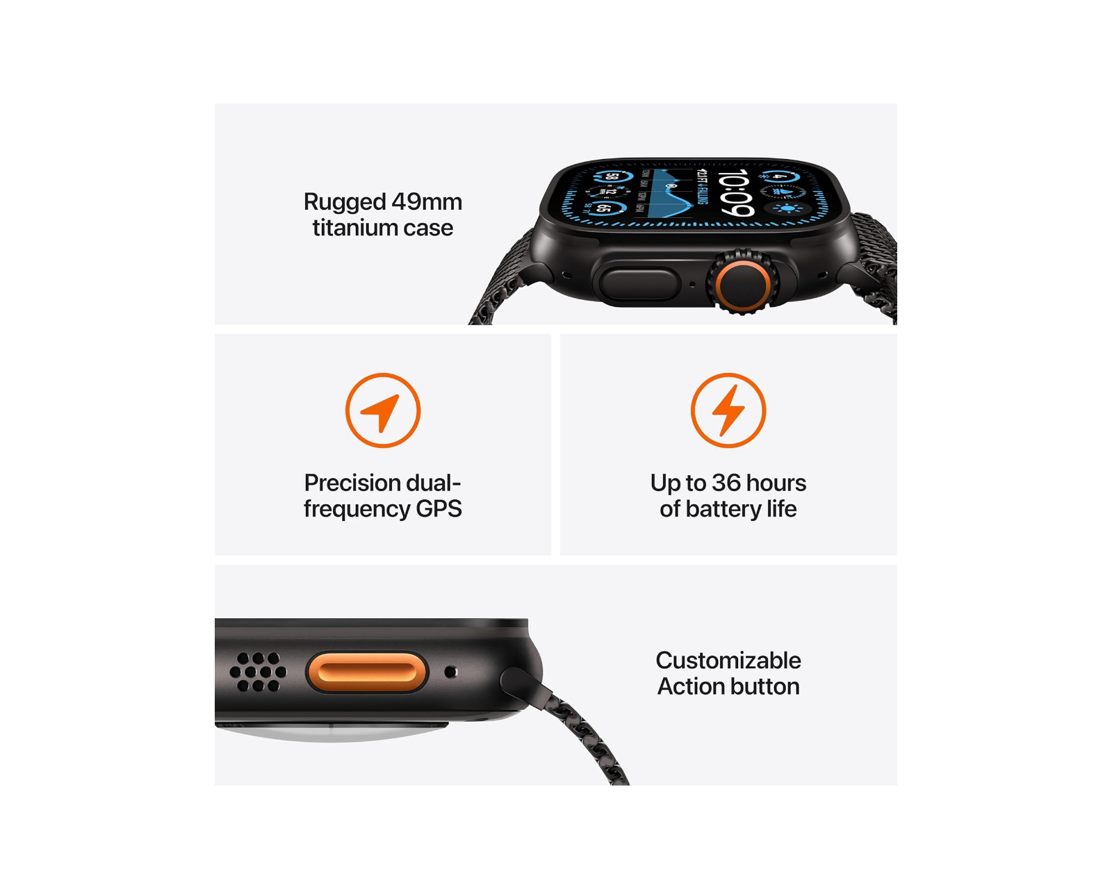 Apple Watch Ultra 2 on älykello, joka yhdistää kestävän muotoilun edistyksellisiin terveys- ja kuntoilutoimintoihin. Se on varustettu Retina OLED -näytöllä ja toimii sekä 4G LTE- että Bluetooth 5.3 -verkoissa. Yli kolmen mikrofonin ja kaksinkertaisten kaiuttimien ansiosta ääni on kristallinkirkasta kaikissa puheluissa ja viesteissä.Titaniumista valmistettuna ja äärimmäisiin olosuhteisiin suunniteltuna Apple Watch Ultra 2 on vedenkestävä jopa 100 metriin ja lisäksi se on korroosion- ja pölyntiivis. Laaja terveysvalvonta sisältää EKG-, syke- ja lämpötila-anturit, jotka tarjoavat tarkkaa tietoa käyttäjän terveydestä. Aina päällä oleva näyttö, jota suojaa safiirilasi, varmistaa, että tieto on aina helposti saatavilla ja näkyvissä jopa kirkkaassa auringonvalossa.