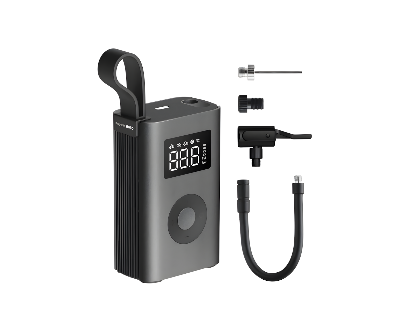 Elektrinen Ilmapumppu (ADV) on kompakti sähköinen ilmakompressori HOTO:lta, suunniteltu pumppaamaan renkaat polkupyöriin, moottoripyöriin ja autoihin. Siinä on digitaalinen paineensäätö, joka vaihtelee 3:sta 150 psi:hin, ja se sammuu automaattisesti asetetussa paineessa. Pumppu muistaa myös viimeisimmän asetuksen seuraavaa käyttöä varten.Tätä ilmapumppua voidaan käyttää maantiepyöriin, e-pyöriin, moottoripyörärenkaisiin, autorenkaisiin, palloihin ja muihin täytettäviin esineisiin. Se on varustettu sisäänrakennetulla litiumakulla, joka tarjoaa tarpeeksi tehoa useiden pyörä- ja autorenkaiden pumppaamiseen ja latautuu nopeasti USB-C:n kautta. Pieni näyttö näyttää lataustilan. Pakettiin sisältyvät Schrader-, Presta-, Dunlop- ja neulaventtiiliadapterit sekä korkean paineen ilmaletku ja säilytyspussi.