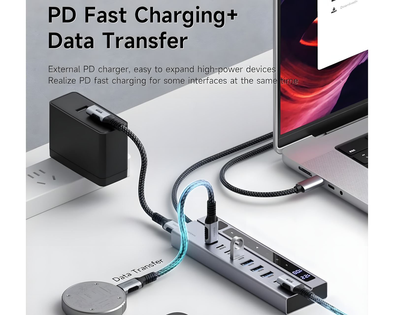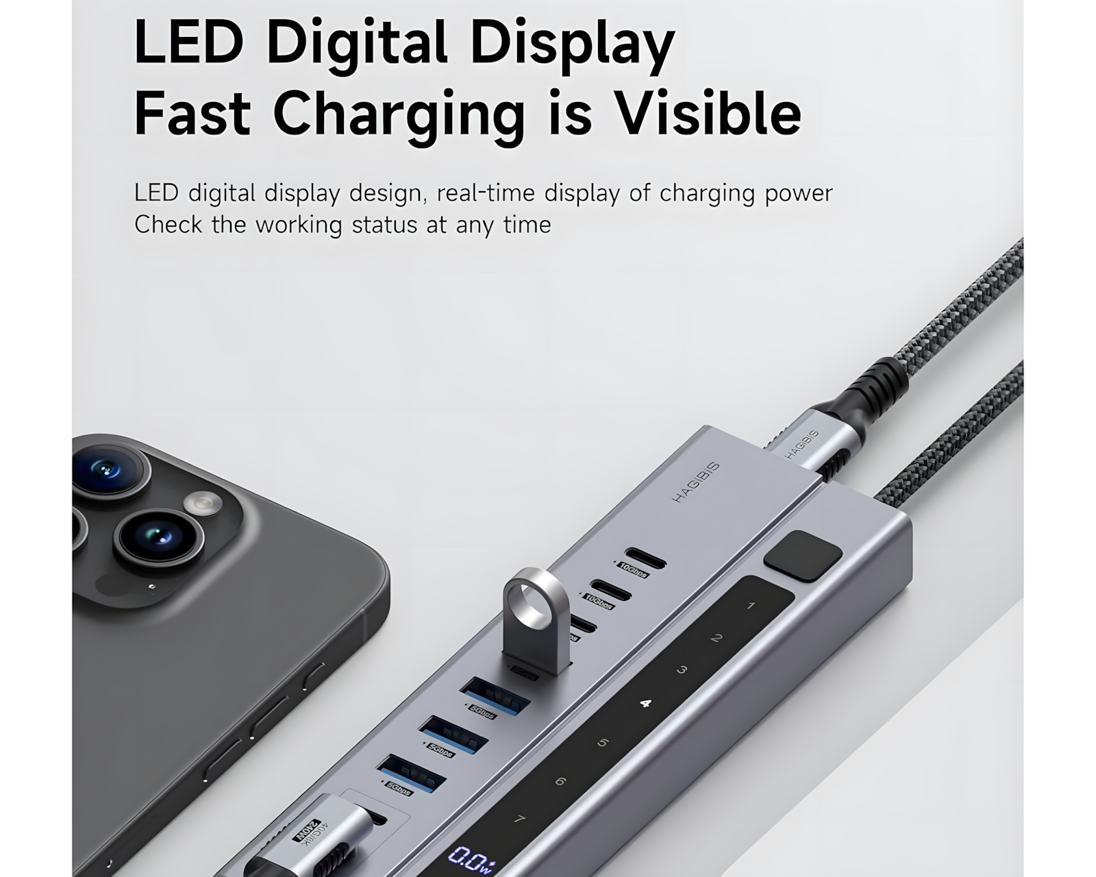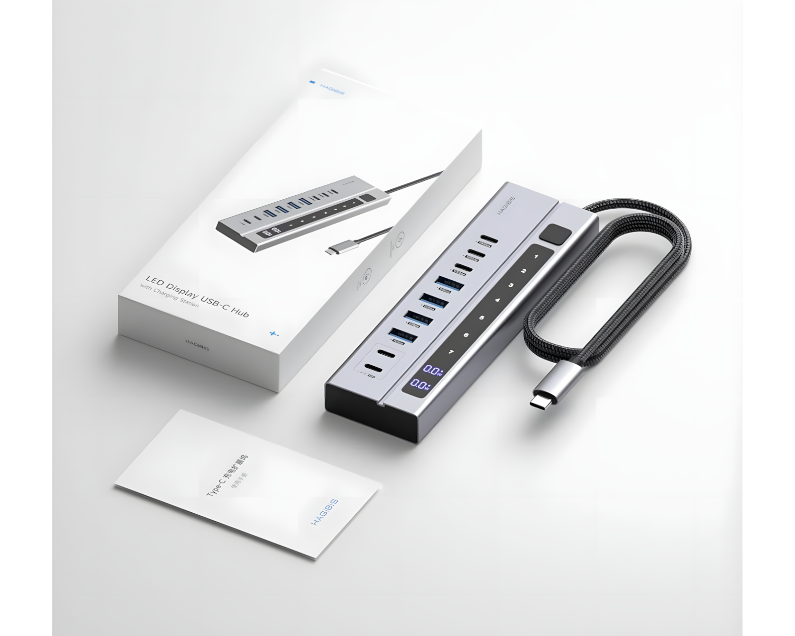 Hagibis USB C Hub on 9-in-1 USB-C-telakone, joka yhdistää eri liitäntävaihtoehtoja yhteen laitteeseen. Se tarjoaa kolme USB-C 3.2 10Gbps-porttia, neljä USB-A 3.0 5Gbps-porttia ja kaksi USB-C PD-latausporttia. Hubia on tarkoitus käyttää kannettavien tietokoneiden, pöytätietokoneiden, pelikonsolien ja muiden USB-C-porttia tukevien laitteiden kanssa.Laite on valmistettu korkealaatuisesta alumiinista ja sisältää kestävän punotun kaapelin kolmen jalan pituudella. Hubissa on kytkin, joka hallitsee kaikkia portteja, mikä eliminoi tarpeen irrottaa ja kytkeä uudestaanusein. USB-C-hubi vaatii toimiakseen ulkoisen PD-laturin, jonka teho on vähintään 65W. Latausasema voi toimittaa jopa 45W liitetyille laitteille, mikä tekee siitä käyttökelpoisen älypuhelinten ja tablettien lataamiseen. Tiedonsiirtonopeudet jopa 10Gbps USB-C:lle ja 5Gbps USB-A:lle mahdollistavat nopean tiedostojen siirron.
