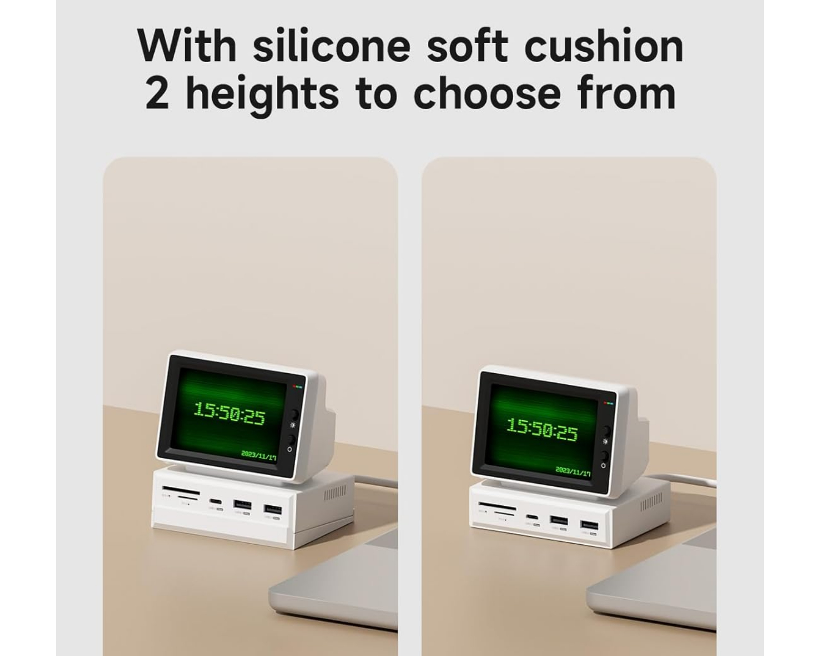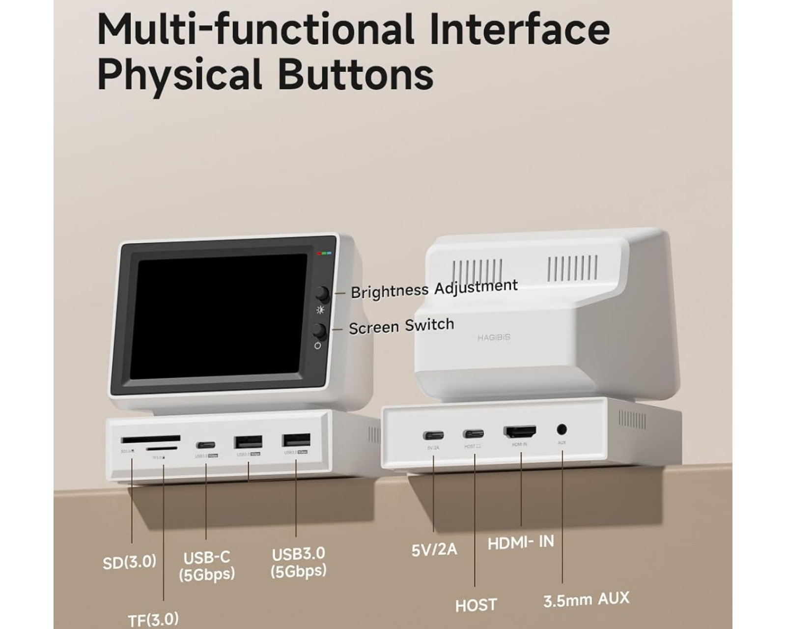 Hagibis 3,5" IPS USB-mini näyttö on monipuolinen laite Hagibisilta, joka yhdistää mini-IPS-näytön USB-C-hubiin. Siinä on 960 x 640 pikselin resoluutio ja se tarjoaa useita liitäntävaihtoehtoja kolmella USB-portilla, mukaan lukien USB 3.0 ja 3.1 Type C. Se on suunniteltu käyttäjille, jotka tarvitsevat kompaktin näyttöratkaisun kannettaville tietokoneille, mukaan lukien yhteensopivuus Dell Latitude 7370:n ja Microsoft Surface -laitteiden kanssa.Tässä mininäytössä on HDMI-liitäntä sekä kortinlukija microSD- ja SDHC-kortteja varten. 5 Gbps:n tiedonsiirtonopeudella se varmistaa nopean ja tehokkaan tiedostonsiirron. Siinä on myös reaaliaikakello ja lämpötilanäyttö, mikä lisää toiminnallisuutta entisestään. Suunnittelussa on silikoninen alusta, joka mahdollistaa näytön korkeuden säätämisen 5 astetta parempaa kulmaa varten.
