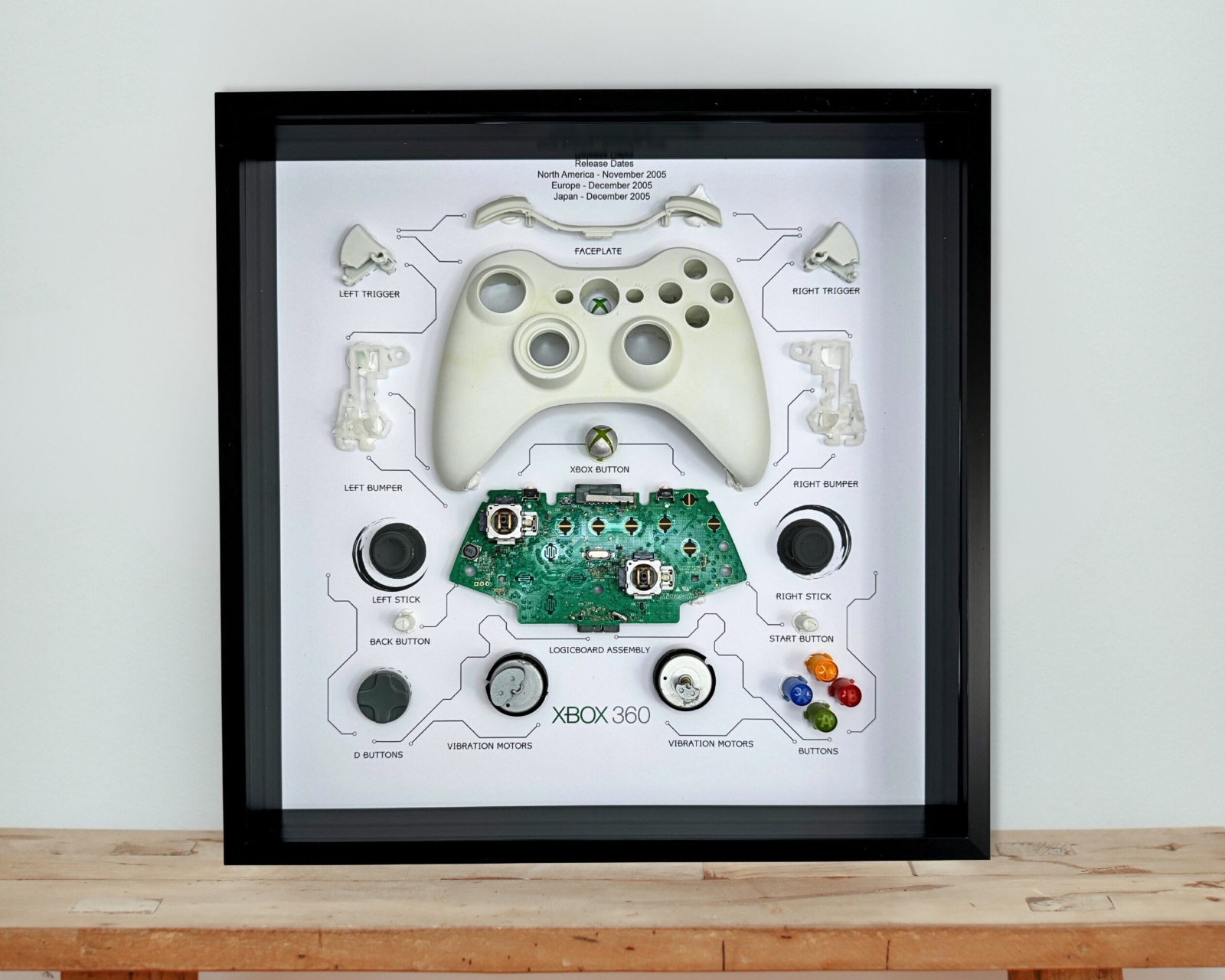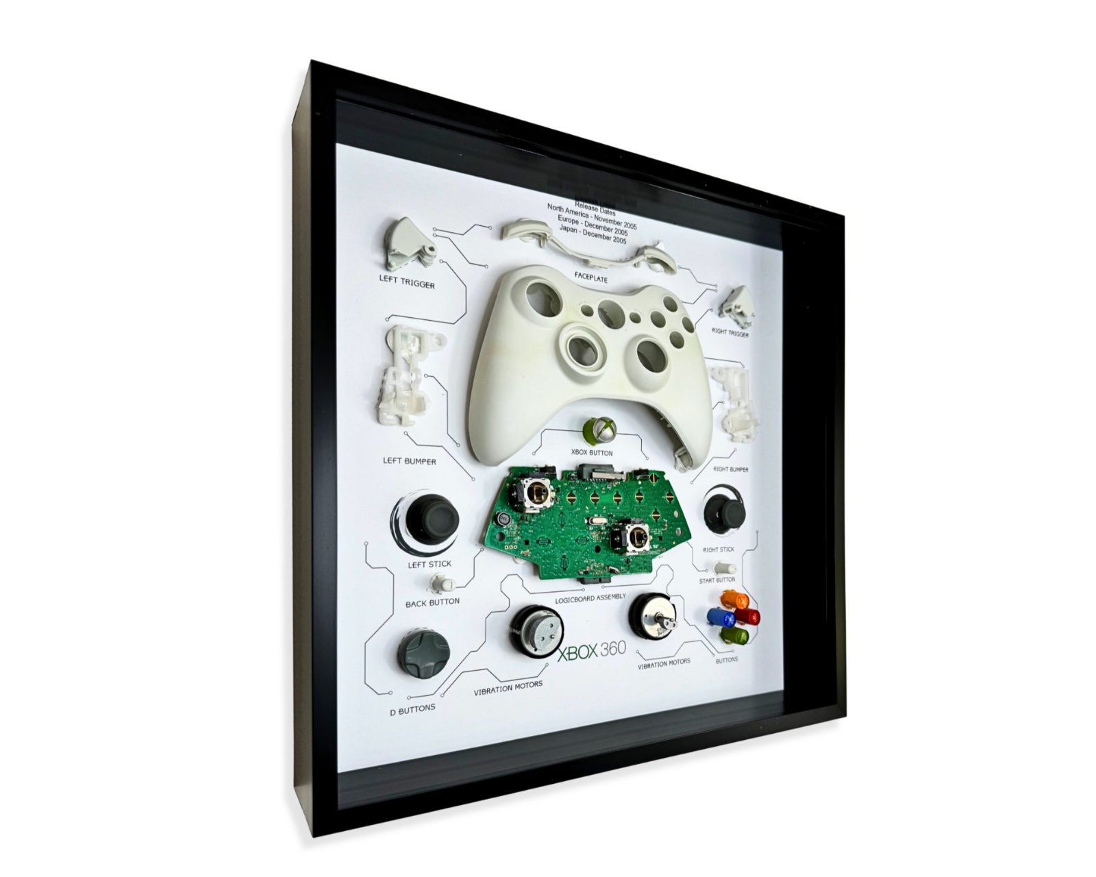Retro Art Microsoft Xbox 360 Langaton Ohjain Näyttö on tuote GRC:ltä, joka toimii visuaalisena esityksenä langattomasta Xbox 360 -ohjaimesta. Se on käsintehty aidoista alkuperäisosista Xbox 360:stä, mikä antaa sille ainutlaatuisen ja retrohenkisen muotoilun.Jokainen osa on huolellisesti sijoitettu harmoniseen asetteluun ja varustettu informatiivisella tarralla, joka kuvaa jokaisen komponentin alkuperää ja suhteellista päivämäärää. Näytön suojaamiseksi siinä on tukeva lasi ja se on kiinnitetty metallikehykseen.