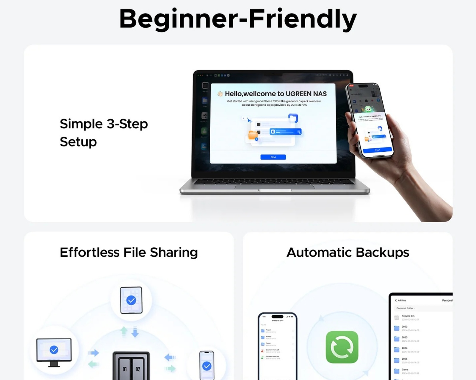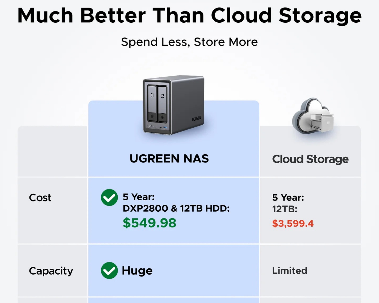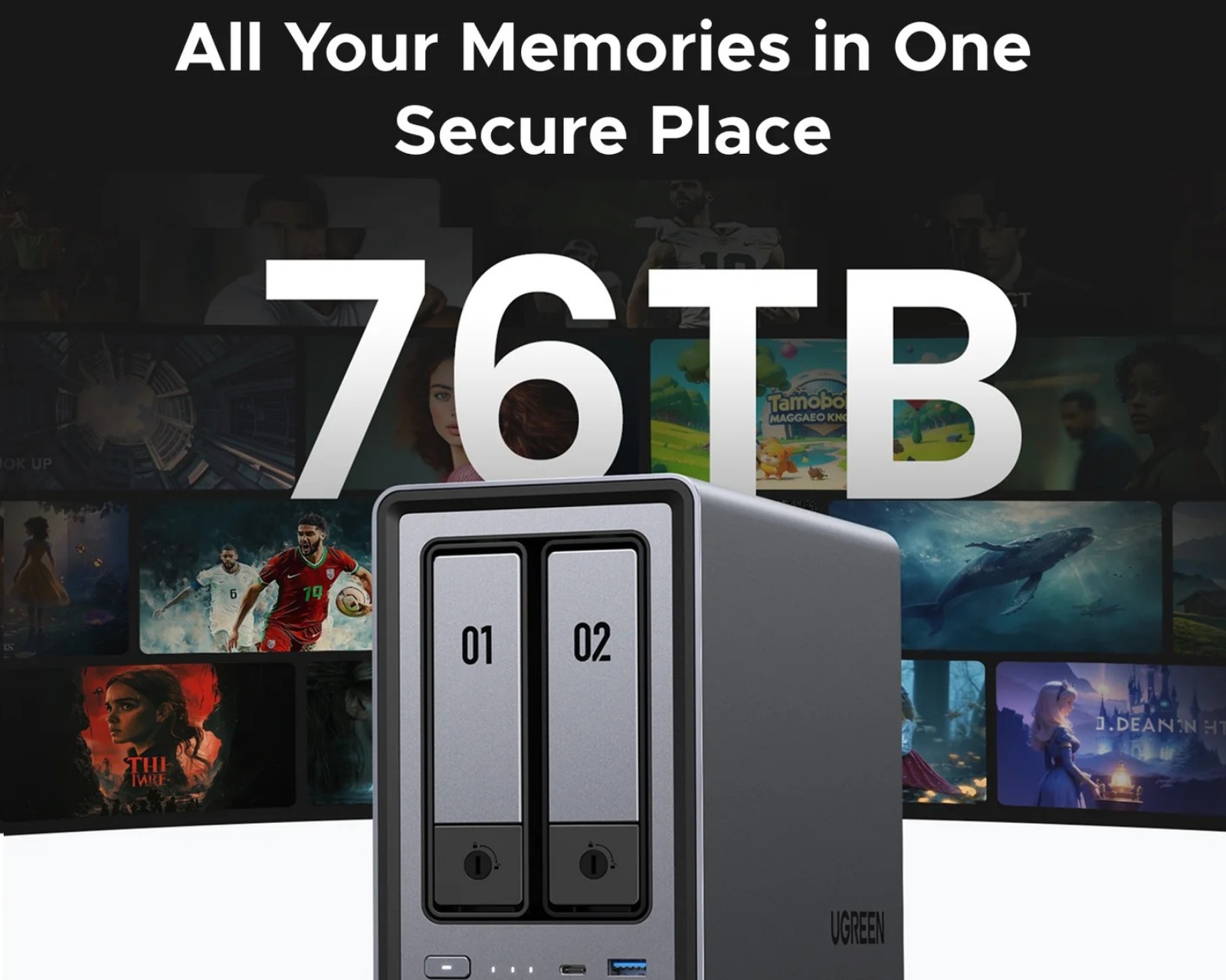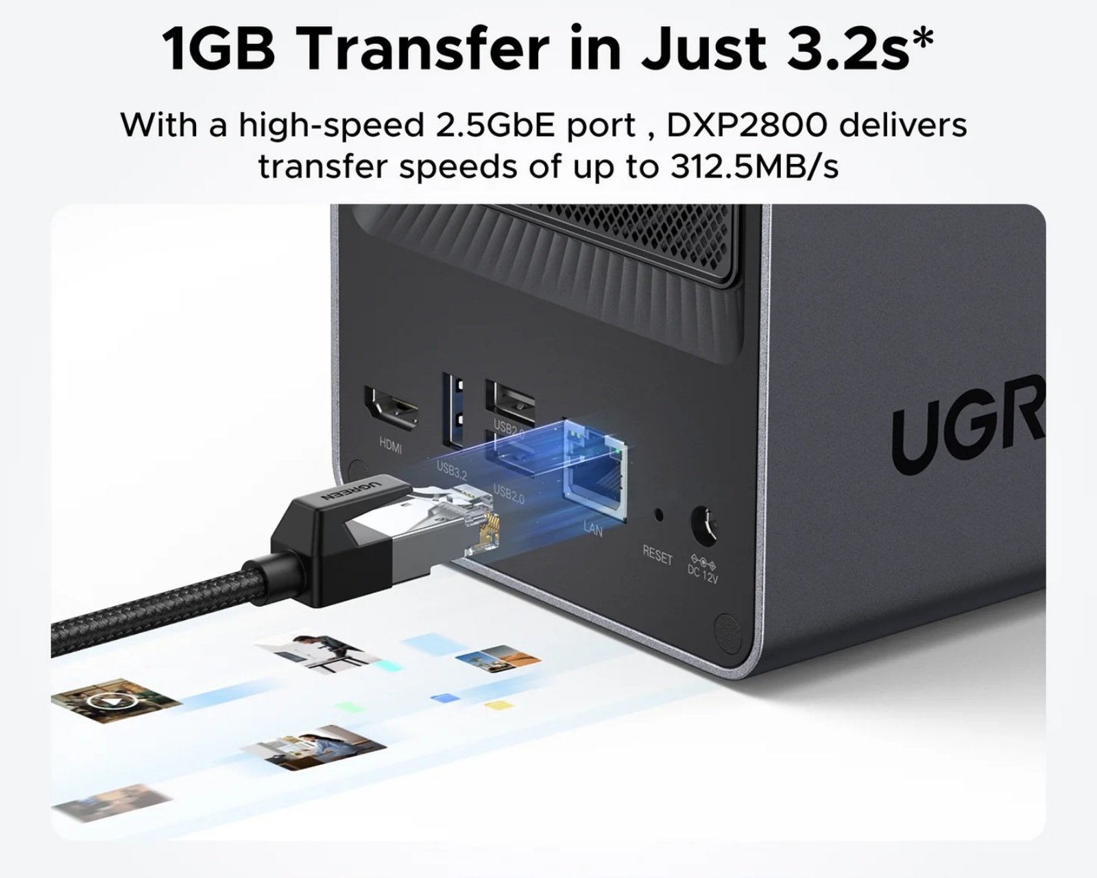 UGREEN NASync DXP2800 on UGREENin NAS (Network Attached Storage), jossa on kaksi lokeroa. Se on varustettu Intel N100 neliytimisellä prosessorilla, 8GB DDR5 RAM-muistilla ja 2.5GbE LAN-portilla. Laite tarjoaa 76TB tallennuskapasiteettia, mikä tekee siitä soveltuvan datan varmuuskopiointiin, automatisoituihin valokuva-albumeihin ja koti-elokuvateatteriin. Se on suunniteltu käyttäjille, jotka tarvitsevat luotettavan tallennusratkaisun, johon on helppo päästä käsiksi ja jakaa useiden laitteiden kesken.UGREEN NASync DXP2800:n rakennelaatu takaa pitkän käyttöiän ja vakaan toiminnan. Se tukee kolmansien osapuolien kovalevyjä tunnetuilta valmistajilta, kuten Western Digitalilta ja Seagatelta. Sen AI-ominaisuuden avulla valokuvien hallinnassa se voi automaattisesti lajitella kuvia kasvokuvien, paikkojen ja objektien mukaan sekä poistaa kaksoiskappaleet. Liitännät sisältävät 4K HDMI videosiirtoon ja korkean nopeuden 2.5GbE verkkoyhteydelle, mikä tekee tiedonsiirroista sujuvia ja nopeita. Laite sisältää myös tehokkaan jäähdytysjärjestelmän, joka pitää melutasot alhaisina.