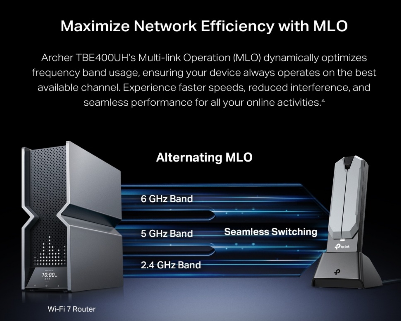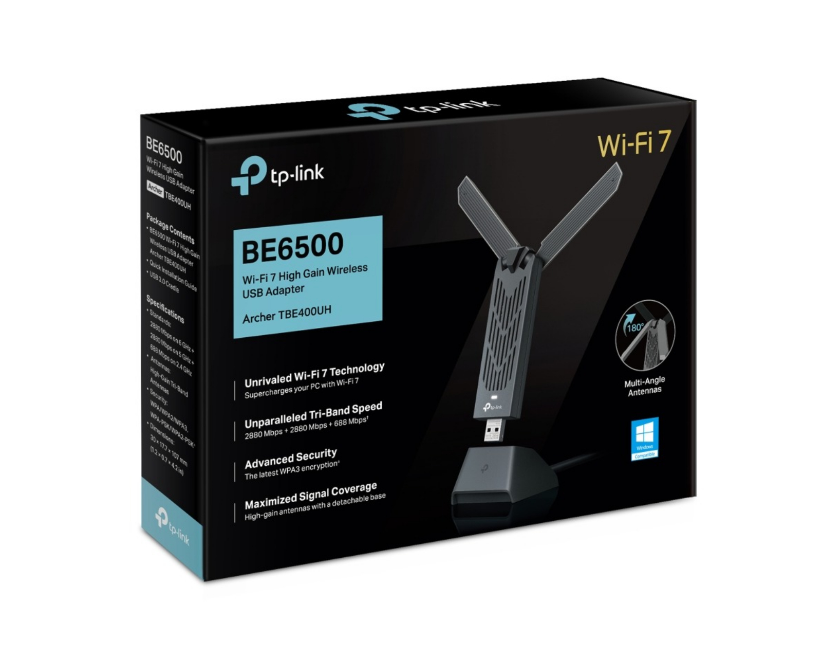 Archer TBE400UH on TP-Linkin korkeasuorituskykyinen langaton USB-adapteri, joka on suunniteltu tarjoamaan maksimaalista nopeutta ja vakautta Wi-Fi 7 -teknologialla. Se tarjoaa nopeuksia jopa 2882 Mbps sekä 6 GHz- että 5 GHz-taajuusalueilla, sekä 688 Mbps 2.4 GHz-taajuudella. Kolmitaajuisen liitännän ja monitoimisen käytön ansiosta tämä adapteri on mukautettu intensiiviseen käyttöön ja voi helposti liittää useampia laitteita samanaikaisesti.Se on rakennettu korkeagain-antennilla ja tukee Beamforming-teknologiaa parantaakseen kattavuutta koko kodissa. TBE400UH hyödyntää Multi-Link Operation -toimintoa optimoidakseen käytettävissä olevien taajuuksien käyttöä, mikä johtaa pienempään latenssiin ja vähemmän häiriöitä pelaamisen ja suoratoiston aikana. USB 3.0 -liitännällä käyttäjät voivat nauttia tiedonsiirtonopeuksista jopa 10 kertaa nopeammina kuin USB 2.0:lla. Mukana tuleva teline, jossa on 1,2 metriä pitkä kaapeli, tarjoaa joustavan asennuksen ja sijoittamisen.