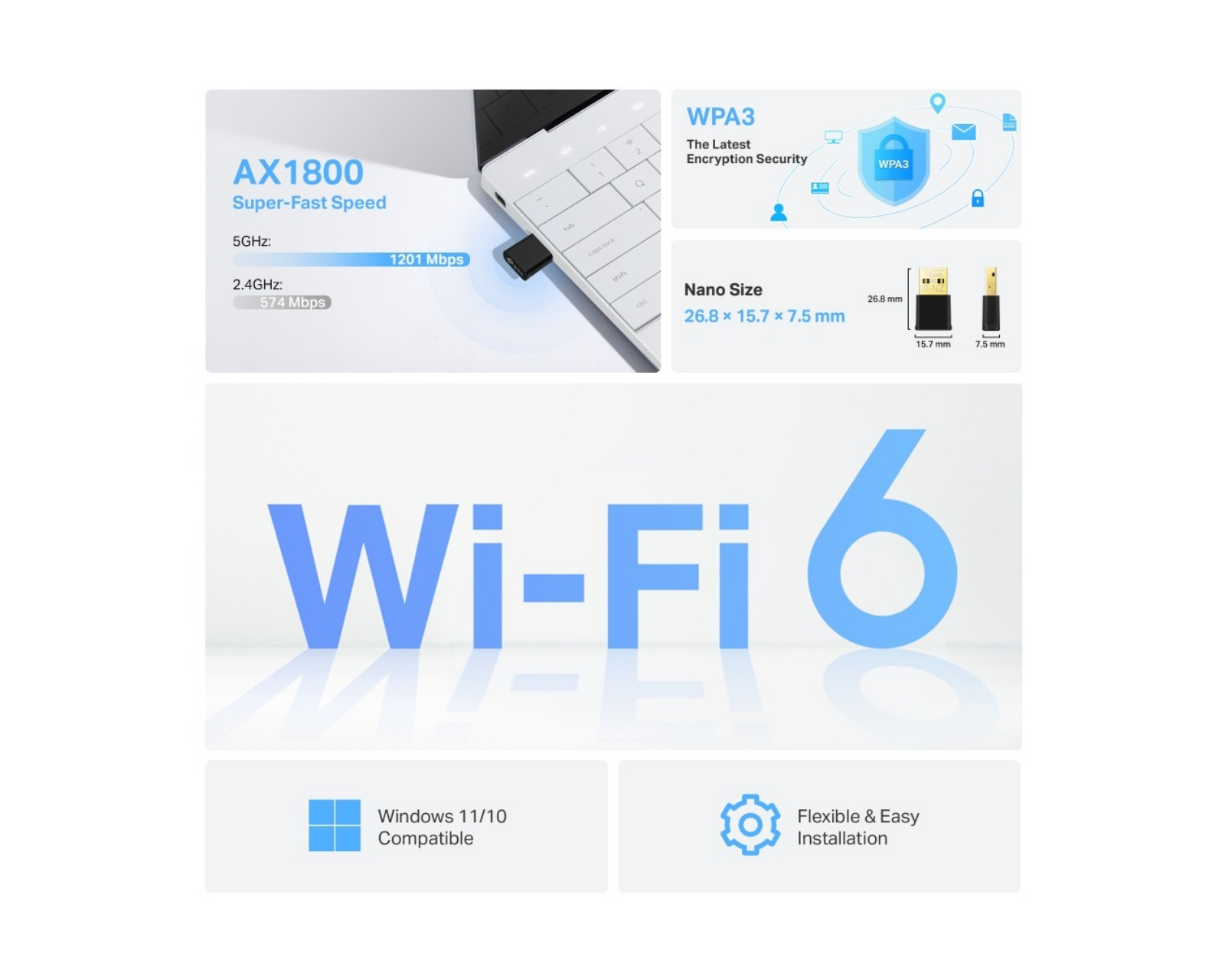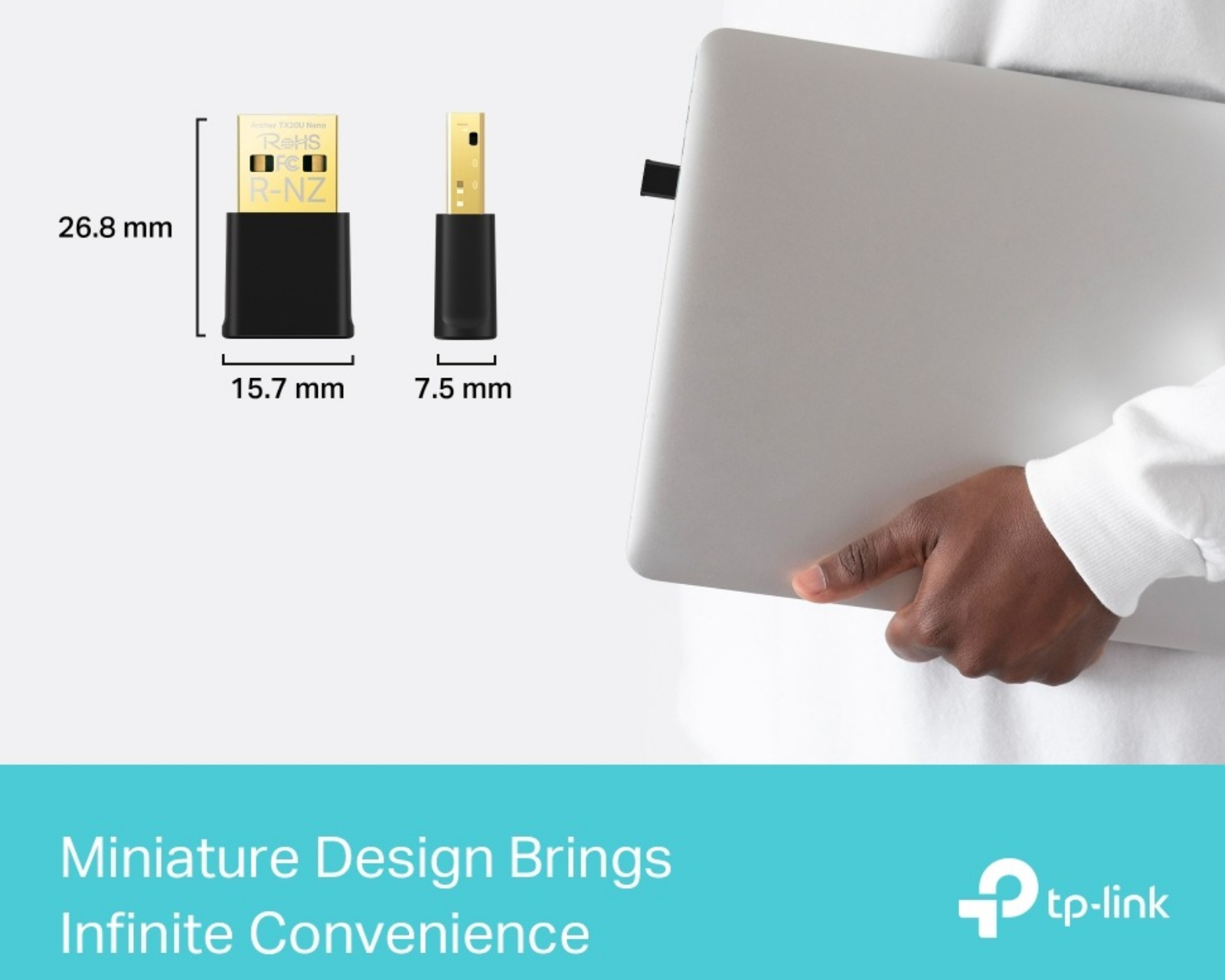 Archer TX20U Nano on TP-Linkin langaton USB-adapteri, joka tarjoaa nopean ja luotettavan yhteyden Wi-Fi 6:n kautta. Tämä kompakti adapteri tarjoaa nopeuksia jopa 1201 Mbps 5 GHz taajuudella ja 574 Mbps 2.4 GHz taajuudella, mikä tekee siitä ihanteellisen pelureille ja verkkoharrastajille, jotka vaativat korkeaa suorituskykyä. Kaksoisbands-toimintojensa ansiosta se mahdollistaa joustavan yhteyden ilman häiriöitä, jotta käyttäjät voivat nauttia sujuvasta online-kokemuksesta.Adapteerin edistykselliset teknologiat, mukaan lukien OFDMA ja MU-MIMO, takaavat alhaisemman viiveen ja tehokkaamman tietojensiirron useille laitteille samanaikaisesti. Kompakti koko 26.8 x 15.7 x 7.5 mm tekee siitä helpon kuljettaa ja asentaa; lisäksi ohjain on esiasennettu, mikä yksinkertaistaa asetusta. Archer TX20U Nano on myös yhteensopiva Windows 11/10:n kanssa, mikä tekee siitä monipuolisen ratkaisun eri käyttäjille. WPA3-salausprotokollan avulla saat myös parannettua suojaa kyberuhilta.