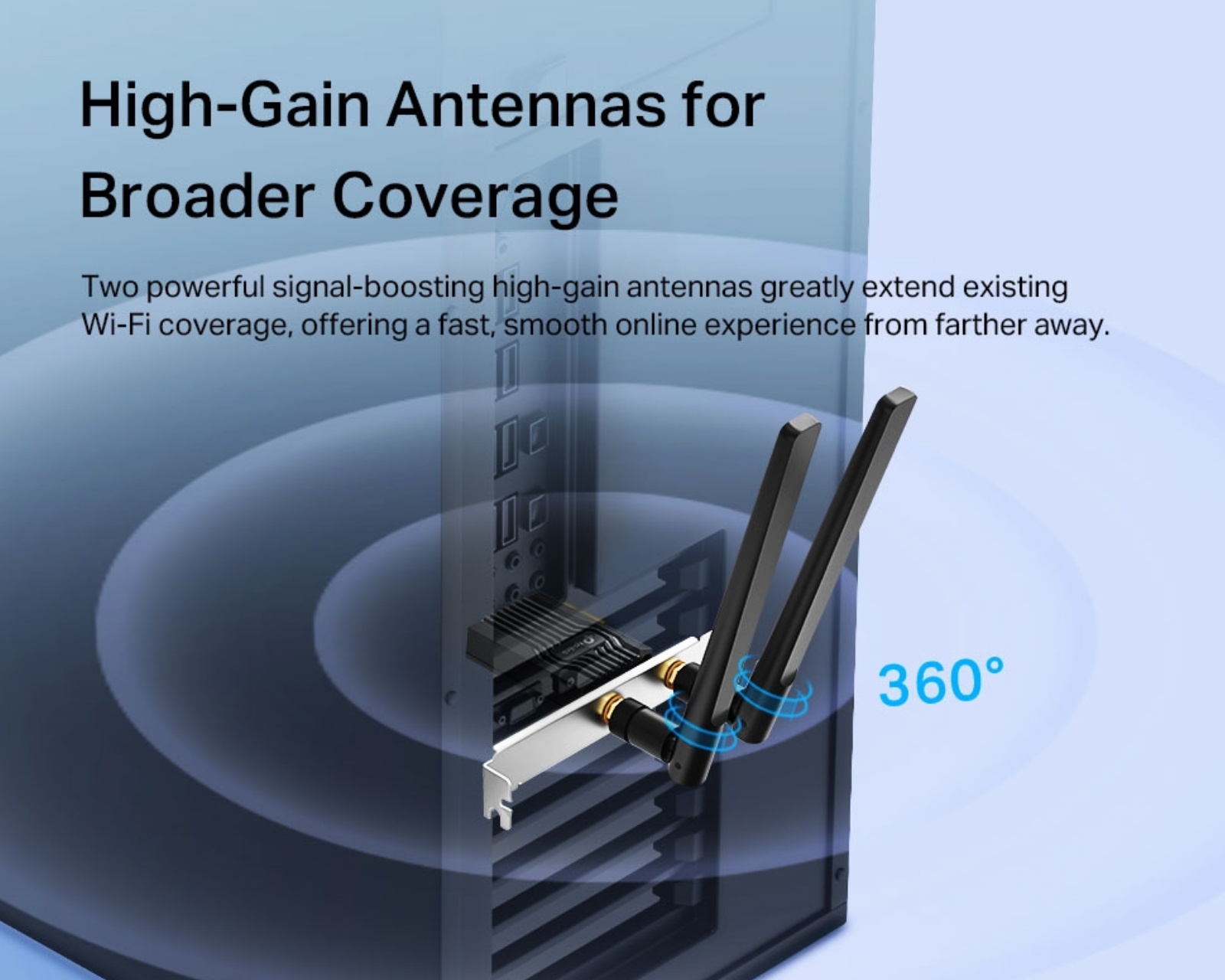 Archer TX55E on TP-Linkin PCIe-adapter, joka mahdollistaa edistyksellisen langattoman yhteyden Wi-Fi 6:n ja Bluetooth 5.2:n avulla. Nopeudella jopa 2402 Mbps (5 GHz) ja 574 Mbps (2.4 GHz) se tarjoaa ylivoimaista nopeutta vaativille sovelluksille. Se on suunniteltu käyttäjille, jotka tarvitsevat vakaata ja nopeaa internetyhteyttä, mikä tekee siitä ihanteellisen pelaajille sekä video- ja musiikkistriimaukseen.Tässä laitteessa on Intel® Wi-Fi 6 -sirupaketti, joka tarjoaa parannetut nopeudet ja yhteyksien kirkkauden, vapauttaen täysin Wi-Fi 6 -reitittimesi potentiaalin. Archer TX55E:ssä on kaksi ulkoista korkeasuunta-antennia, jotka laajentavat signaalin peittoa varmistaen vakaan yhteyden eri osissa kotia. Lisäksi se tukee Bluetooth 5.2:ta, mikä tarjoaa nopeammat nopeudet ja laajemmat kattavuudet kuin aiemmat versiot. Se on myös taaksepäin yhteensopiva 802.11ac/a/b/g/n -standardeihin lisäämään joustavuutta.