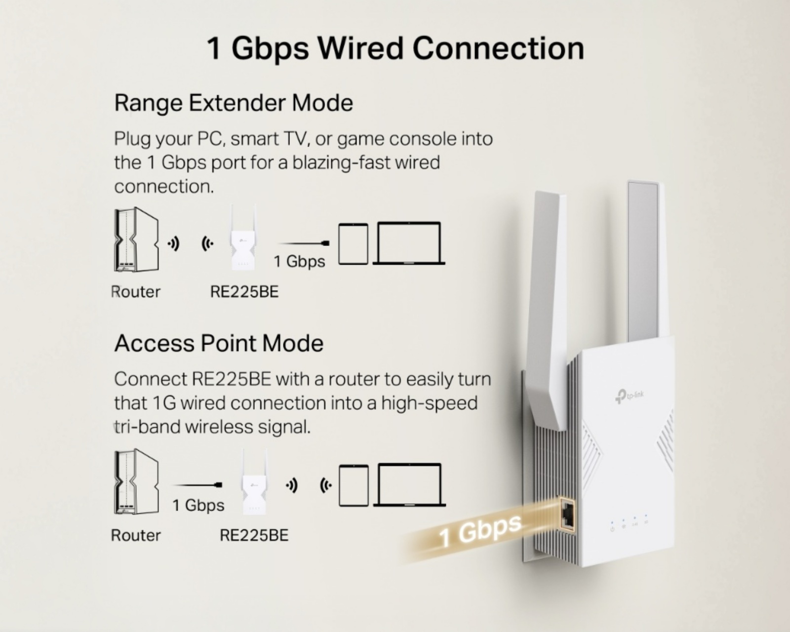 RE225BE BE3600 Dual-Band Wi-Fi 7 Laajennin on TP-Linkin korkean suorituskyvyn verkkoratkaisu, joka on suunniteltu laajentamaan Wi-Fi-verkkoasi. Nopeudet jopa 3,6 Gbps (2882 Mbps 5 GHz:llä ja 688 Mbps 2,4 GHz:llä) takaavat vakaan ja nopean internet-kokemuksen suoratoistoon, pelaamiseen ja moniajoon kotona tai työympäristössä.Tämä laajennin tukee Multi-Link Operation (MLO) -toimintoa, joka parantaa läpivientikykyä ja vähentää viivettä hyödyntämällä useita yhteyksiä samanaikaisesti. Varustettuna Gigabit Ethernet -portilla se mahdollistaa nopeat langalliset yhteydet laitteisiin, kuten äly-TV:hen, tietokoneisiin ja pelikonsolihin. Lisäksi se tarjoaa Smart Roaming -toiminnon, joka mahdollistaa liikkumisen vapaasti huoneiden välillä ilman yhteyden katkeamista. Se on myös yhteensopiva EasyMesh-tekniikan kanssa, jolloin luodaan saumaton Mesh Wi-Fi -järjestelmä koko kotiin, mikä poistaa signaaliongelmat.